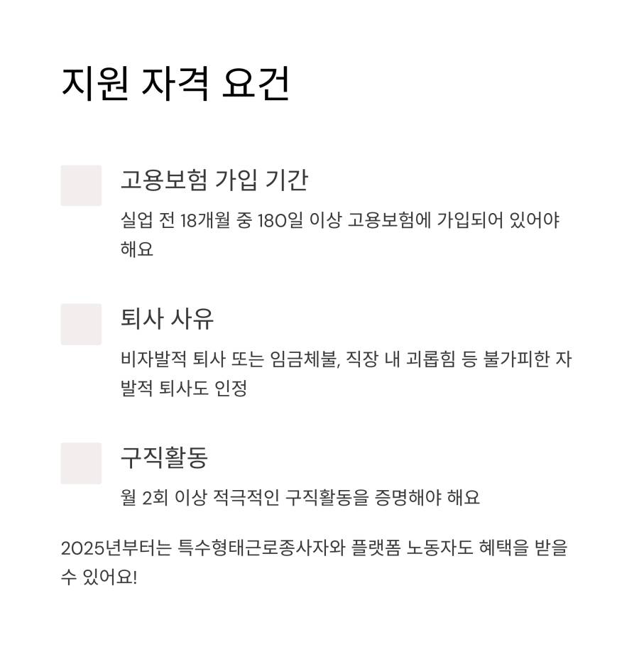2025년에 달라진 점 중 하나는 특수형태근로종사자(특고)와 플랫폼 노동자도 실업급여 대상에 포함되었다는 점이에요! 배달라이더, 보험설계사, 학습지 교사 등도 이제 일정 조건을 충족하면 실업급여를 받을 수 있게 되었어요. 🎉