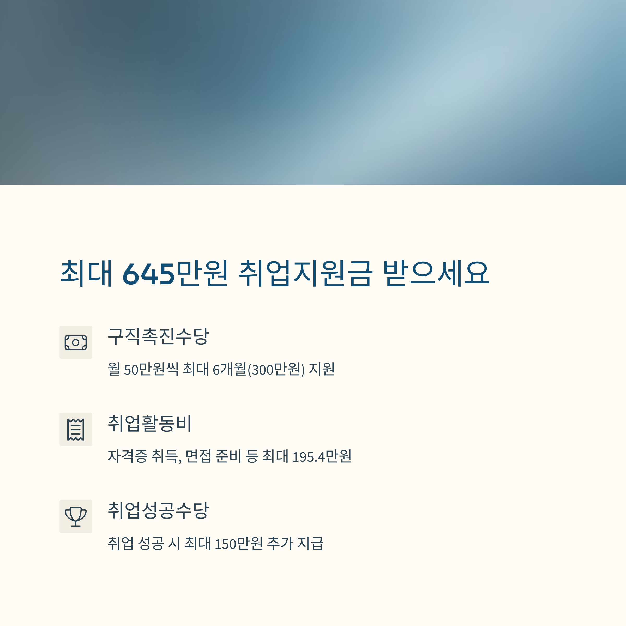 취업에 성공하면 취업성공수당도 받을 수 있어요. 조건을 충족하면 최대 150만원까지 지원받을 수 있으니 이것도 놓치지 마세요!