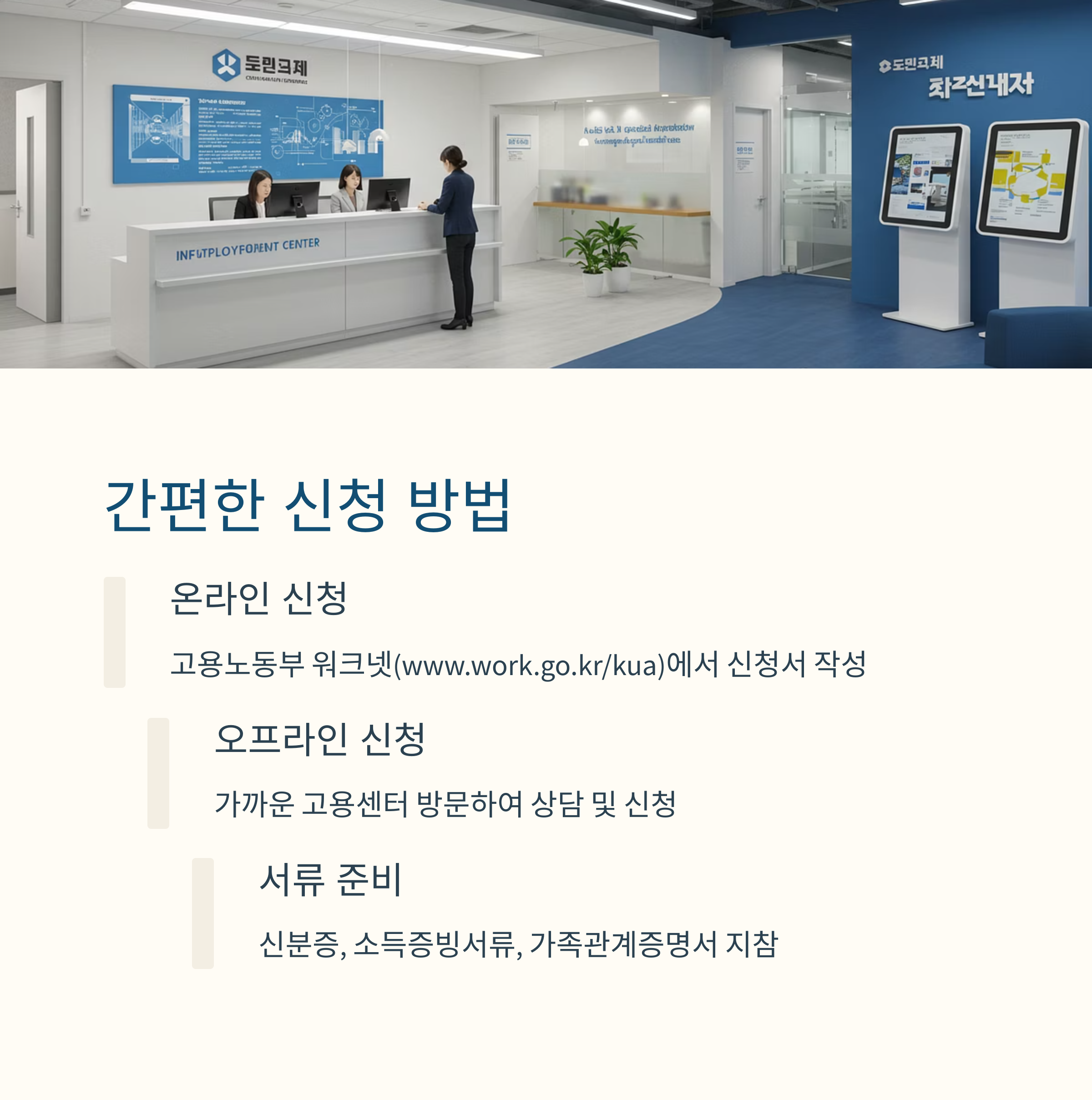 준비해야 할 서류는 신분증, 가족관계증명서, 소득증빙서류 등이 있어요. 자세한 내용은 고용노동부 홈페이지에서 확인하실 수 있답니다. 미리 준비해두면 신청 과정이 더 수월해질 거예요! 👍