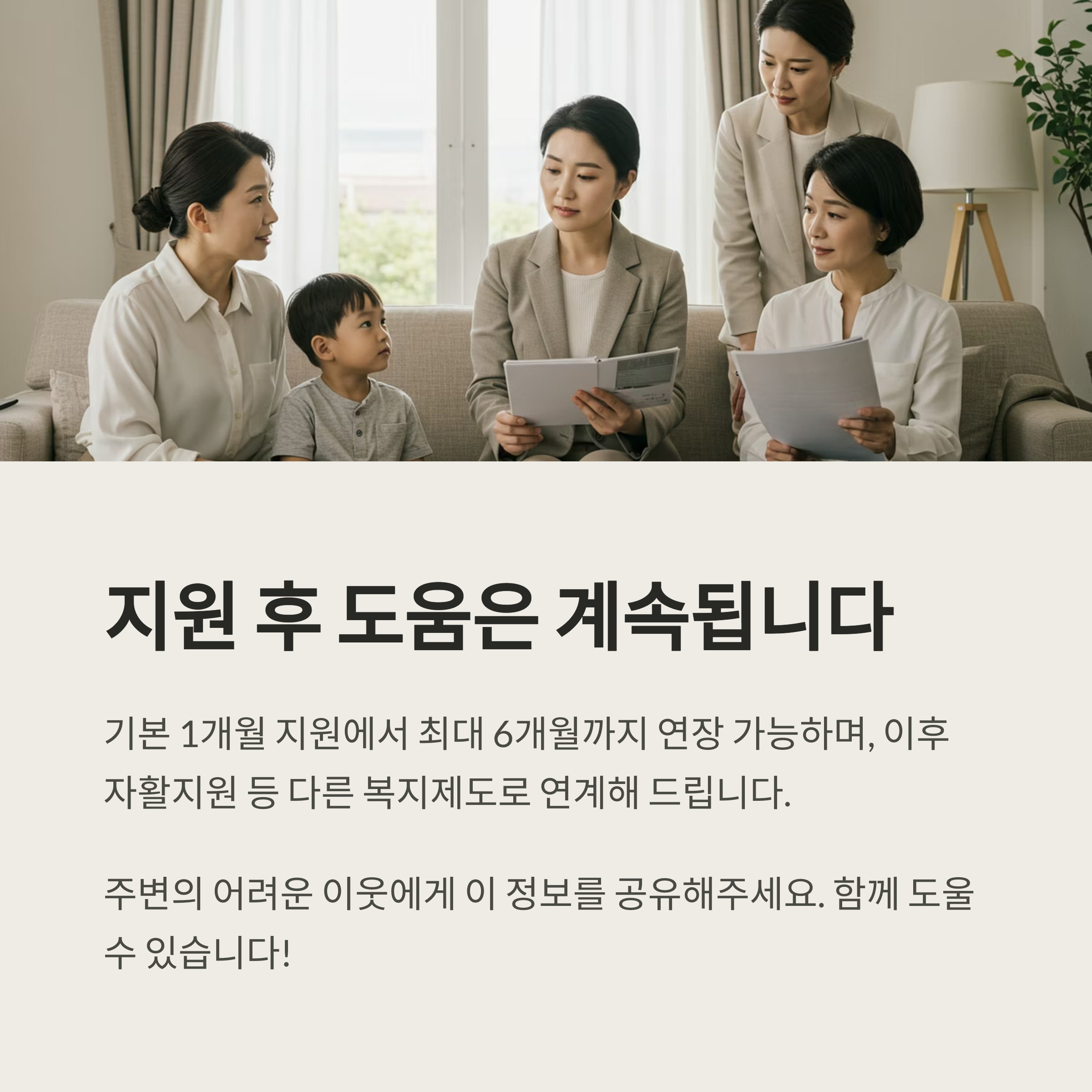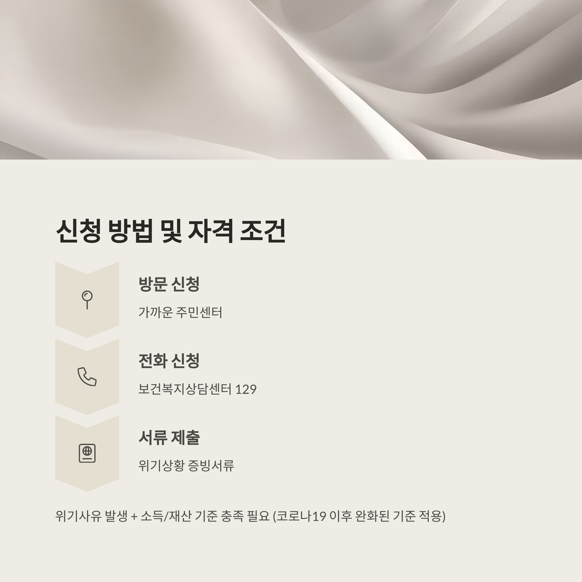 하지만 이런 기준에 해당하지 않더라도, 지자체장이 인정하는 위기가구라면 특례지원을 받을 수도 있어요. 또한 코로나19 이후로는 위기사유와 소득·재산 기준이 한시적으로 완화되어 운영되고 있으니 꼭 문의해보세요!