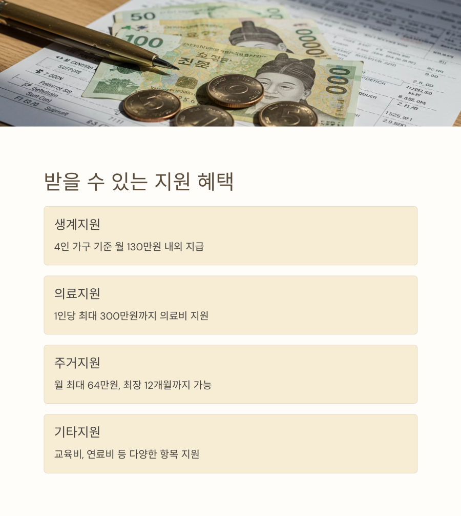 먼저, 생계지원은 식료품비, 의복비 등 생계유지에 필요한 비용을 지원해 주는 제도예요. 4인 가구 기준으로 월 130만원 내외의 지원을 받을 수 있어요. 🏠