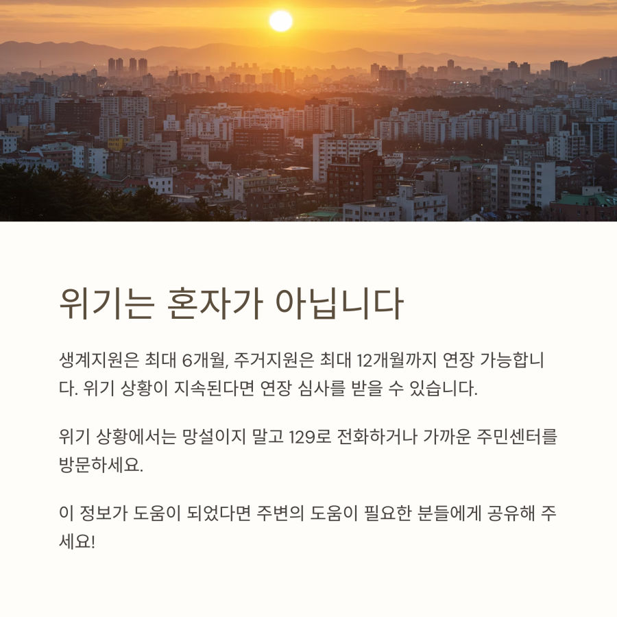생계지원은 기본 1개월이지만, 연장 심사를 통해 최대 6개월까지 지원받을 수 있어요. 의료지원은 1회, 주거지원은 최초 1개월에 최대 12개월까지 연장 가능해요.