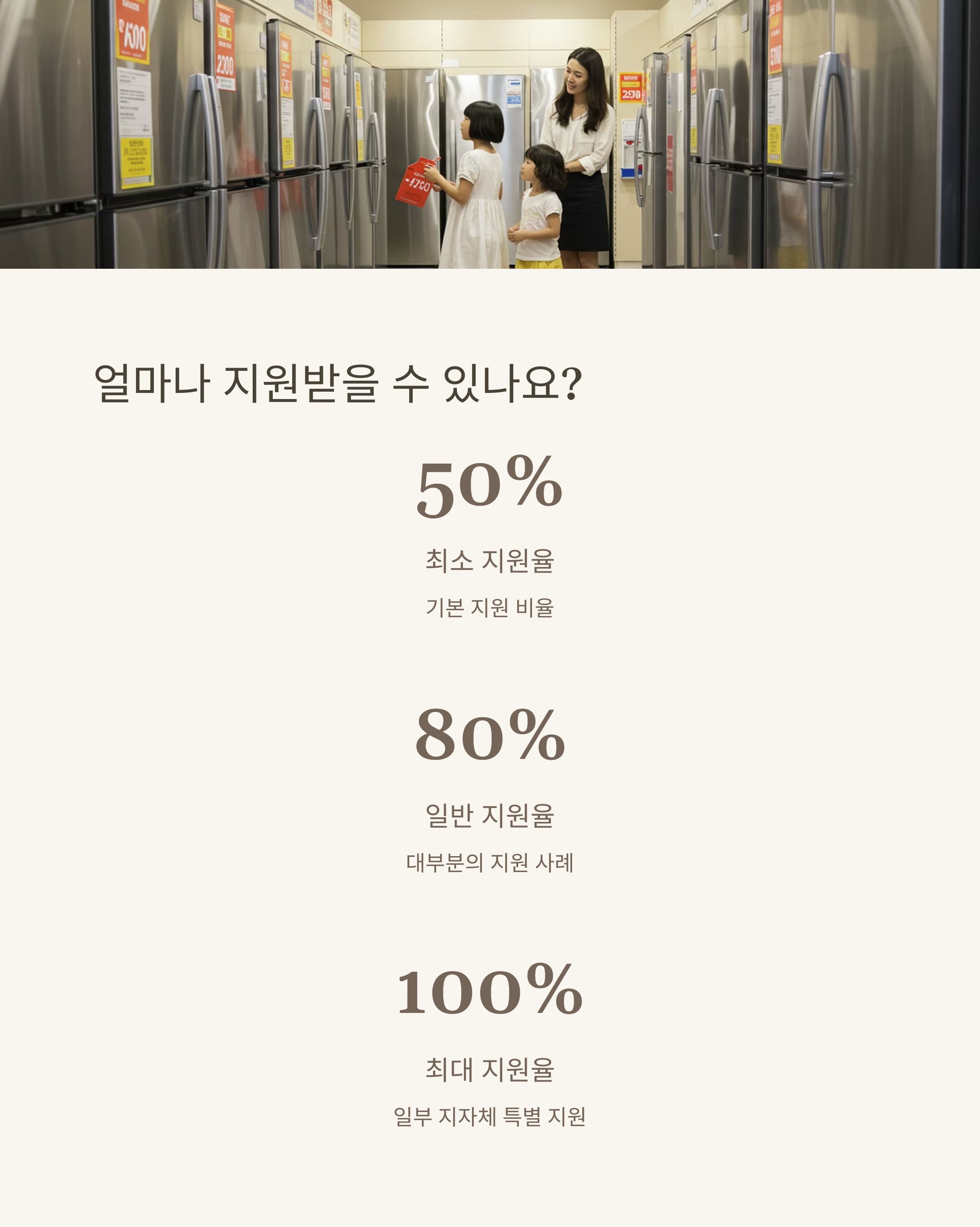 예를 들어, 30만원 상당의 냉장고라면 20만원 정도를 지원받고 본인은 10만원을 부담하는 방식이에요. 물론 지역과 대상자의 상황에 따라 달라질 수 있어요.