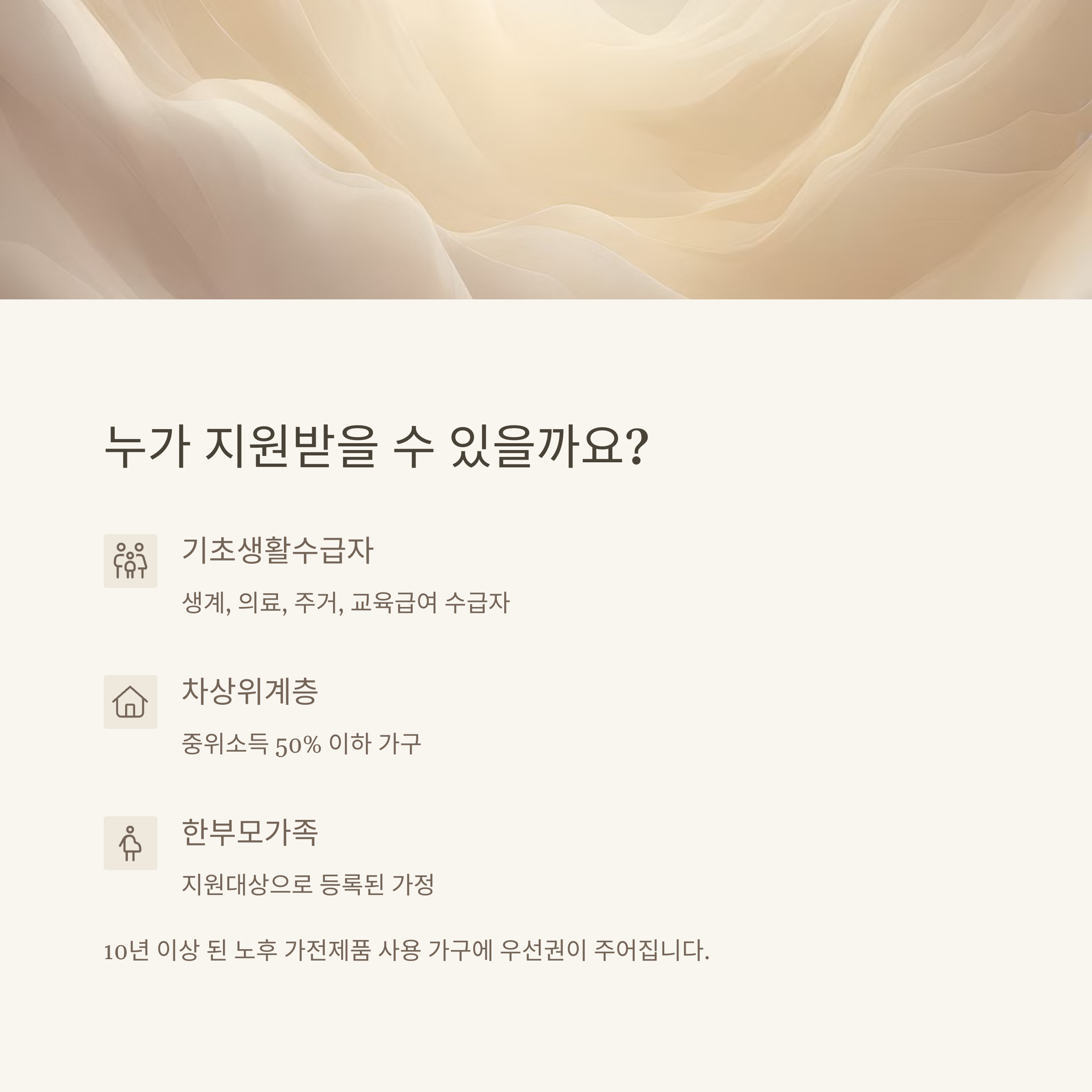 특히 10년 이상 된 노후 가전제품을 사용 중인 가구에 우선순위가 주어지는 경우가 많답니다. 에너지 효율이 낮은 오래된 가전을 사용하는 가정일수록 지원 가능성이 높아져요.