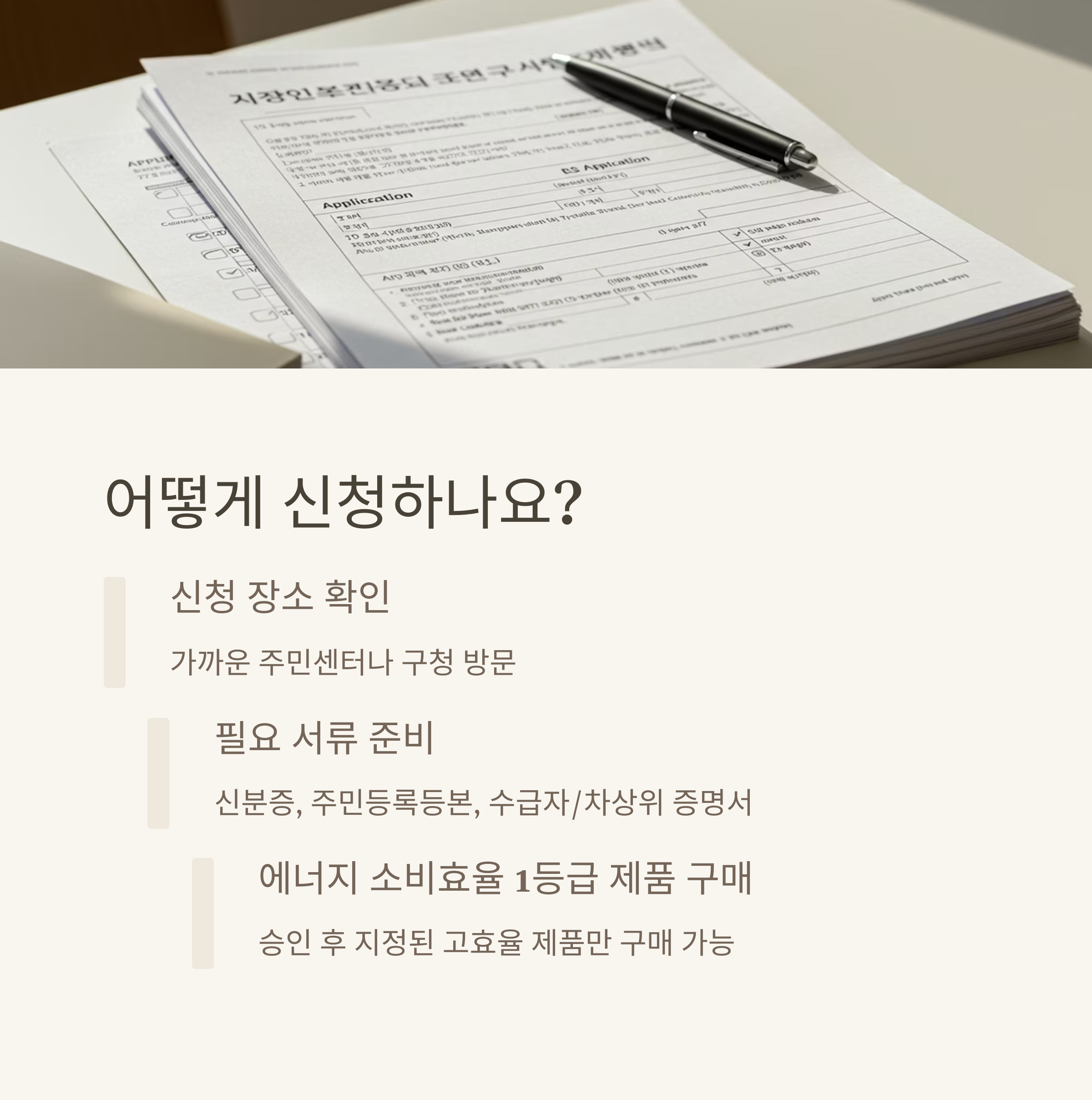필요한 서류로는 신분증, 주민등록등본, 수급자 증명서 또는 차상위계층 증명서 등이 있어요. 구체적인 서류는 지역마다 조금씩 다를 수 있으니 미리 확인하는 것이 좋답니다. 😊