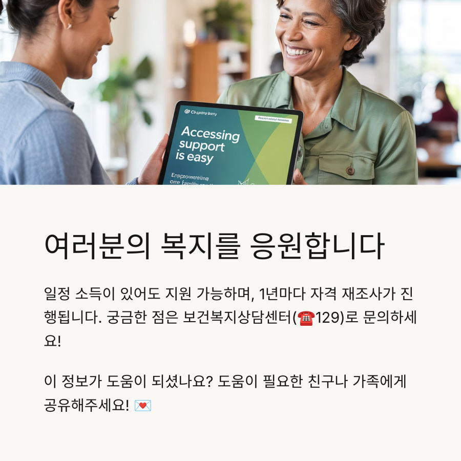 | A: 네, 가능합니다! 최근에는 기준이 완화되어 일정 소득이 있어도 다양한 서비스를 받을 수 있어요. 특히 차상위계층 지원은 중위소득 50% 이하면 신청 가능합니다. |