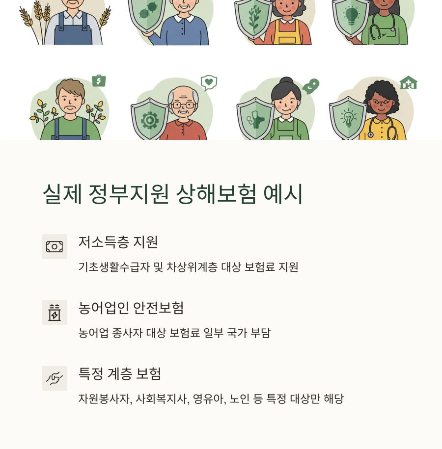 중요한 점은 이런 제도들이 전 국민을 대상으로 하지 않는다는 것이에요. 또한 대부분 '상해보험 가입비를 현금으로 지원'하는 방식이 아닌, '특정 보험에 단체로 가입시켜주는 형태'로 운영되는 경우가 많아요.