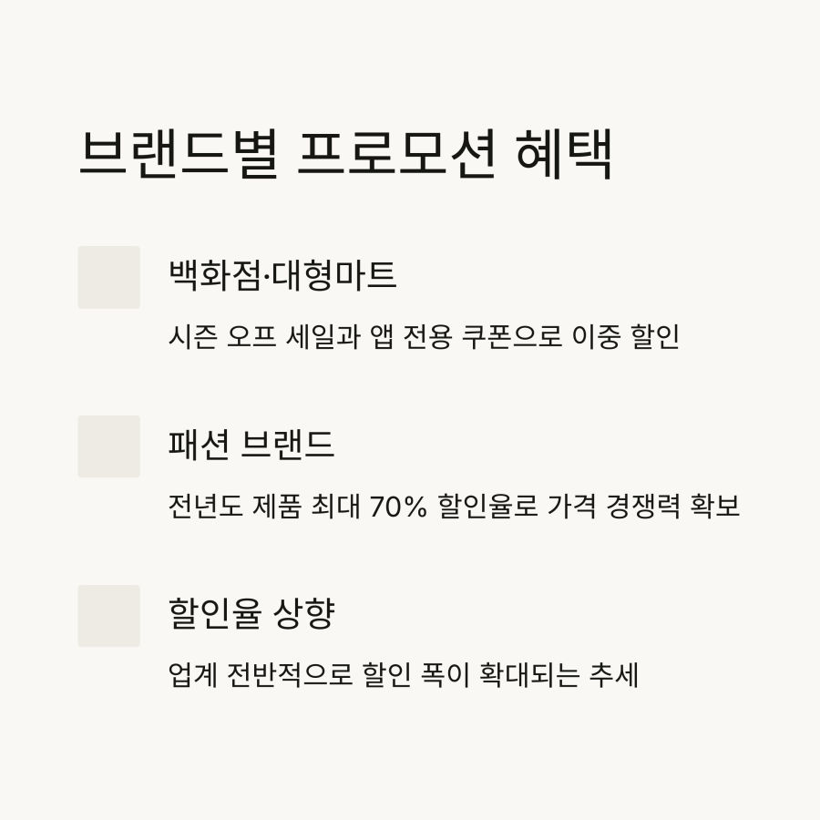 패션 브랜드들은 여름 신상품 출시와 함께 이전 시즌 제품을 최대 70%까지 할인하는 프로모션을 진행 중이에요. 오프라인 매장 방문 시 추가 쿠폰을 제공하는 브랜드도 있으니 체크해보세요!