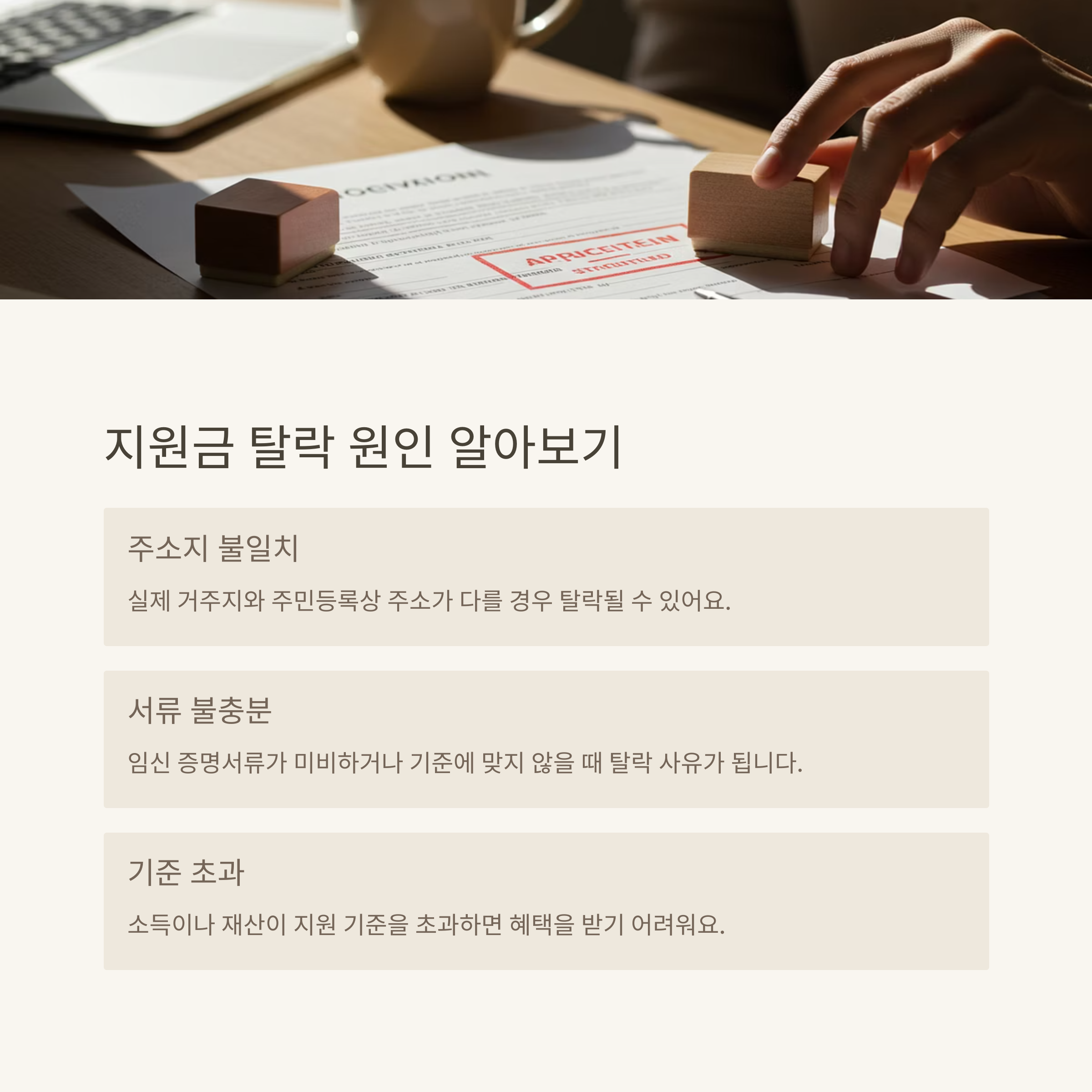 많은 분들이 조건을 충족한다고 생각하고 신청했지만 탈락하는 경우가 있어요. 가장 흔한 탈락 이유를 알아볼까요?