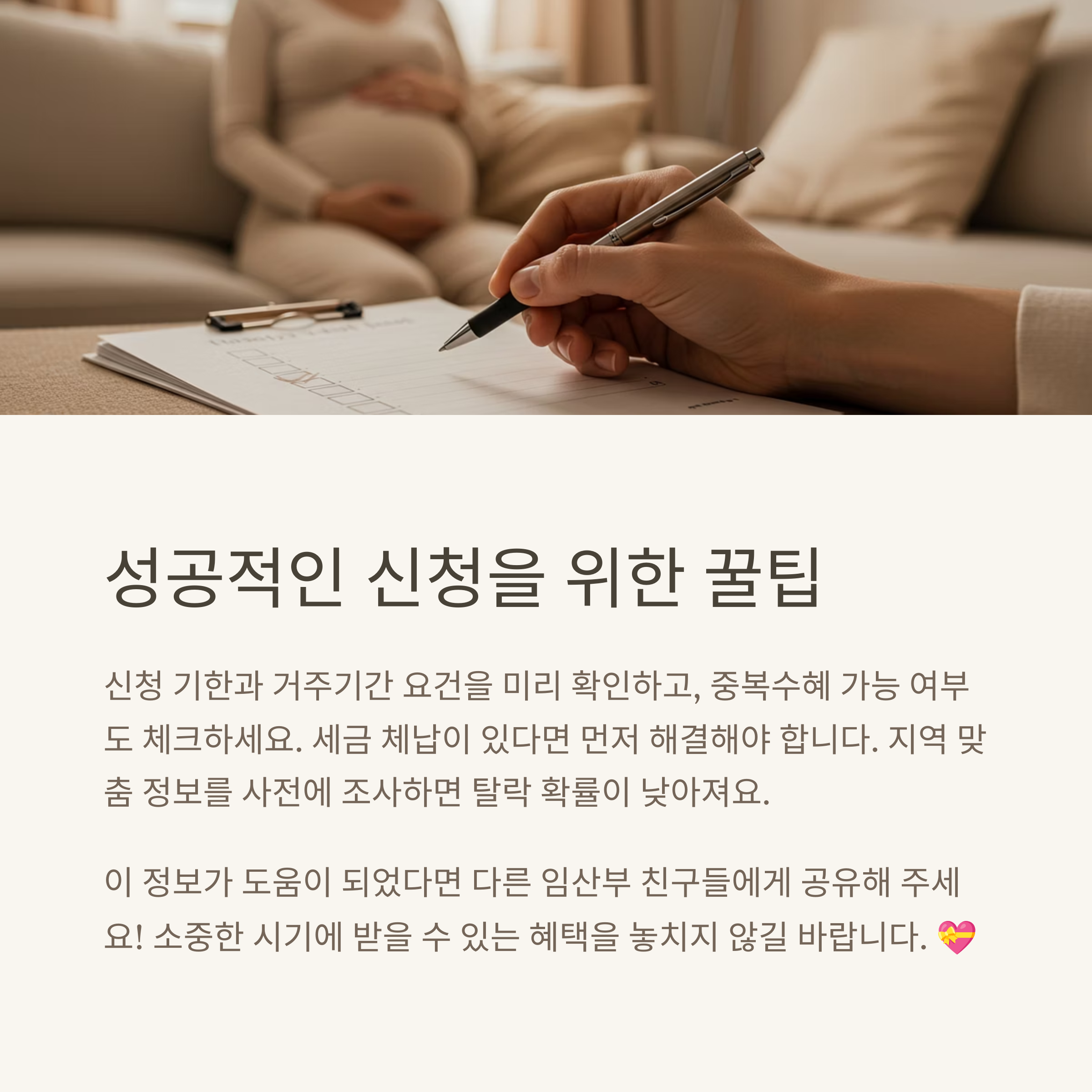첫째, 신청 시기를 놓치지 마세요. 지역에 따라 임신 초기에만 신청 가능하거나, 출산 후 특정 기간 내에만 신청 가능한 경우가 있어요.