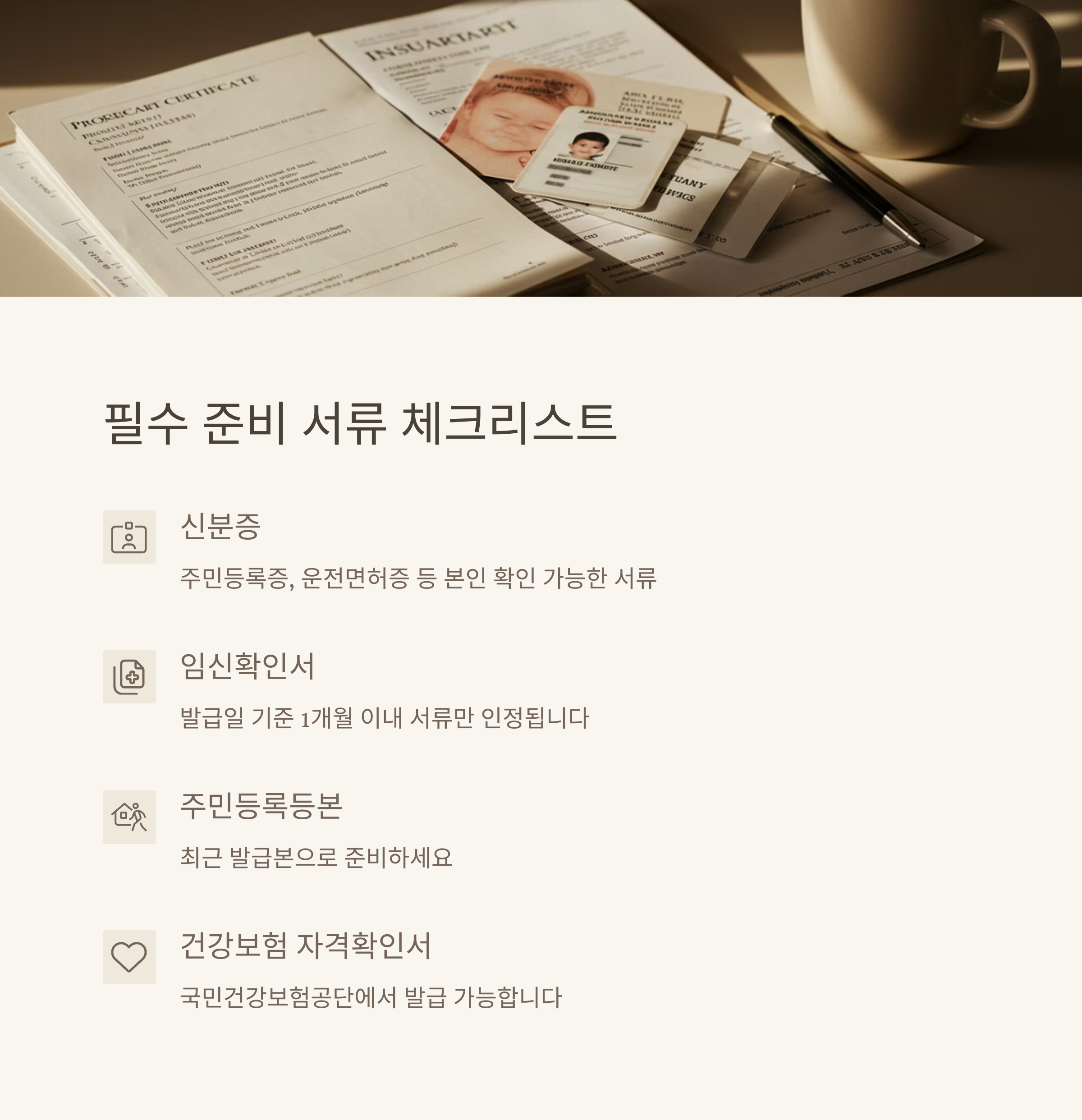 기본적으로 신분증과 임신 확인서는 필수예요. 임신 확인서는 발급일로부터 보통 1개월 이내의 것만 인정되니 최근에 발급받은 것으로 준비하세요.