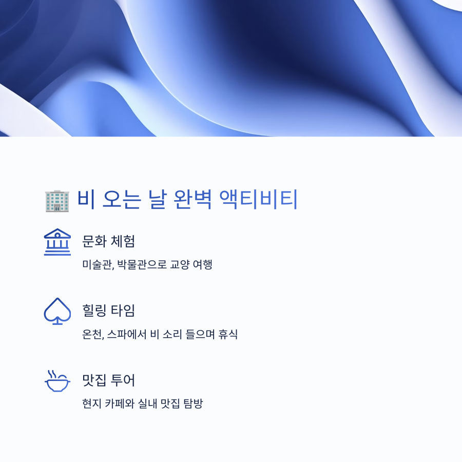 비가 올 확률이 높은 날에는 실내 활동 위주로 일정을 조정하시는 게 좋아요. 박물관, 미술관, 쇼핑몰, 온천 등 실내에서 즐길 수 있는 곳들을 미리 찾아보세요. 🏛️