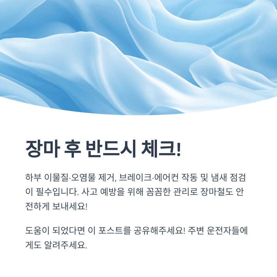 장마철 자동차 관리, 생각보다 어렵지 않죠? 😊 위에서 소개해드린 관리법만 잘 지켜도 여러분의 소중한 차를 깨끗하고 안전하게 유지할 수 있을 거예요.