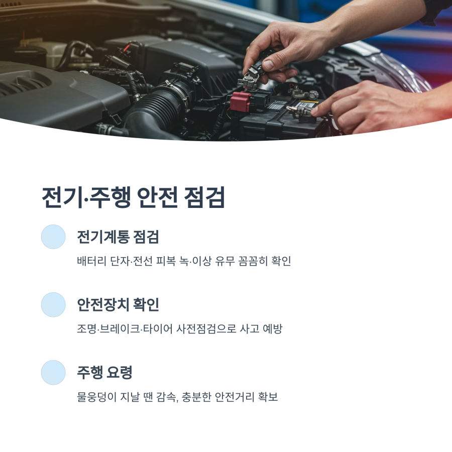 장마철에는 전기 시스템에 특히 주의해야 해요. 배터리 단자에 녹이 슬지 않았는지 확인하고, 필요하다면 청소해주세요.