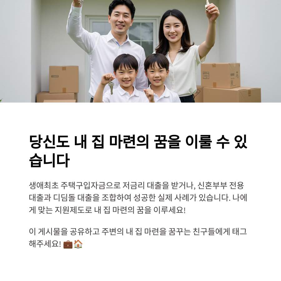 실제로 정부 지원을 통해 내 집을 마련한 사례를 살펴볼까요? 30대 직장인 김씨는 생애최초 주택구입자금을 활용해 1억 원 가량의 대출을 3% 이하의 금리로 받을 수 있었어요.