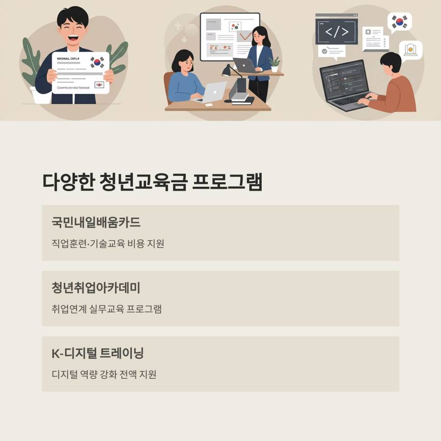 청년교육금에는 여러 종류가 있어요. 가장 대표적인 것이 국민내일배움카드와 청년취업아카데미, 그리고 각 지자체별 청년 지원 사업이에요.