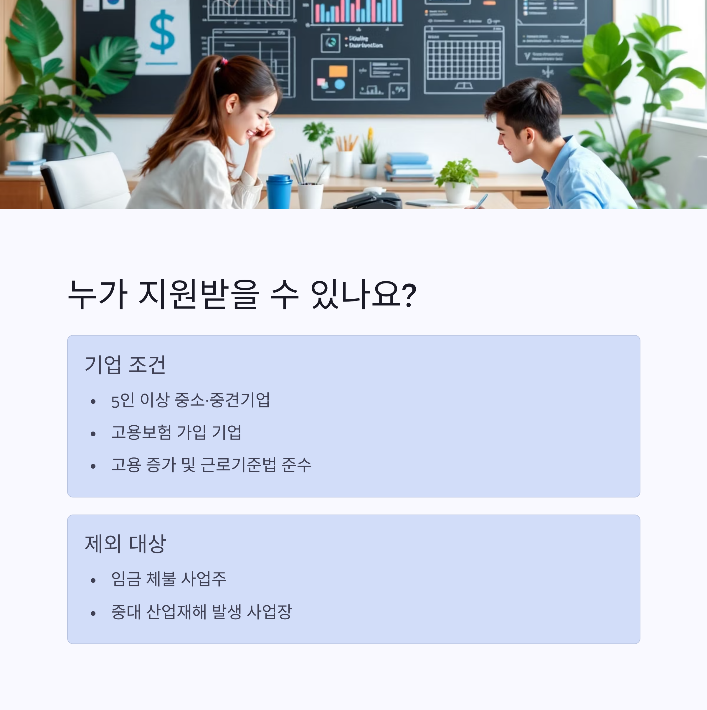 모든 기업이 지원받을 수 있는 것은 아니에요. 주요 지원 대상은 5인 이상 중소·중견기업이며, 고용 보험에 가입되어 있어야 한답니다.