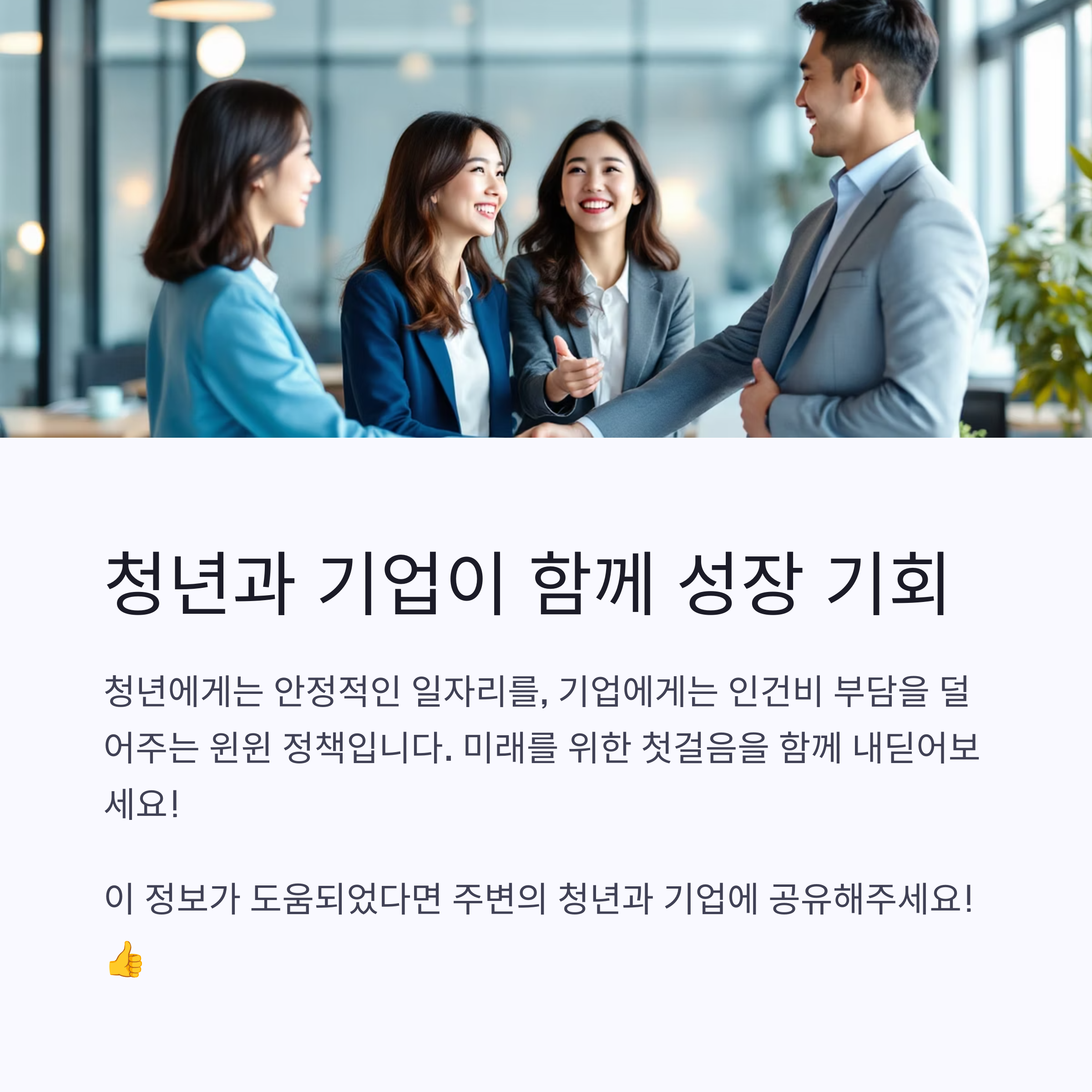 기업과 청년 모두 윈-윈할 수 있는 이 제도를 잘 활용하여 더 많은 청년들이 좋은 일자리를 찾고, 기업은 우수한 인재를 확보하는 기회가 되길 바라요! 🌟