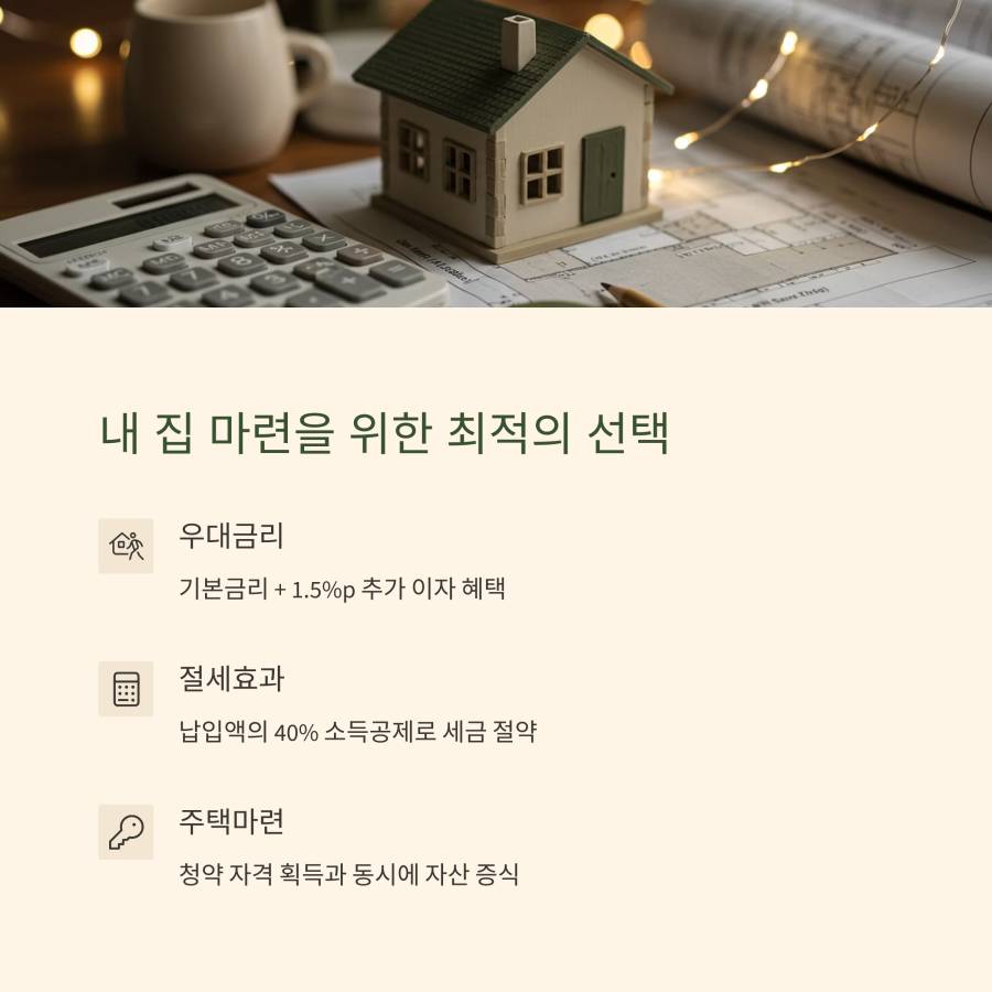 기본금리에 1.5%p의 우대금리가 더해져 총 연 4~5%대의 금리를 받을 수 있으며, 연 600만원 한도 내에서 40%의 소득공제 혜택도 제공돼요. 이 혜택을 통해 세금도 절약하고 내 집 마련을 위한 자금도 효과적으로 마련할 수 있어요. 🏡