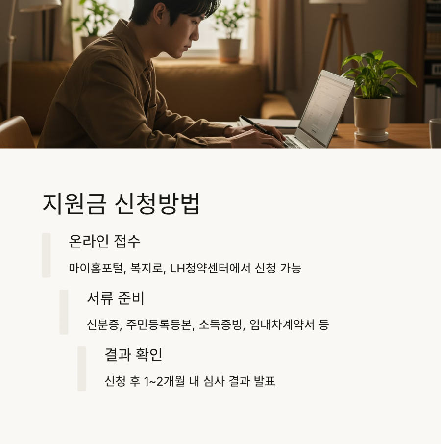 신청 시 필요한 서류는 신분증, 주민등록등본, 소득 증빙 서류, 임대차계약서 등이 있어요. 미리 준비해두면 신청이 더 수월할 거예요! 😊