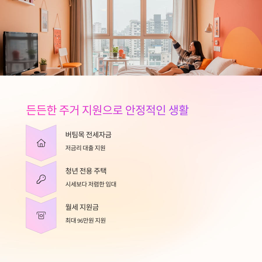 청년 전용 버팀목 전세자금 대출, 청년 전용 주택 임대, 월세 지원 등 다양한 혜택이 있답니다.