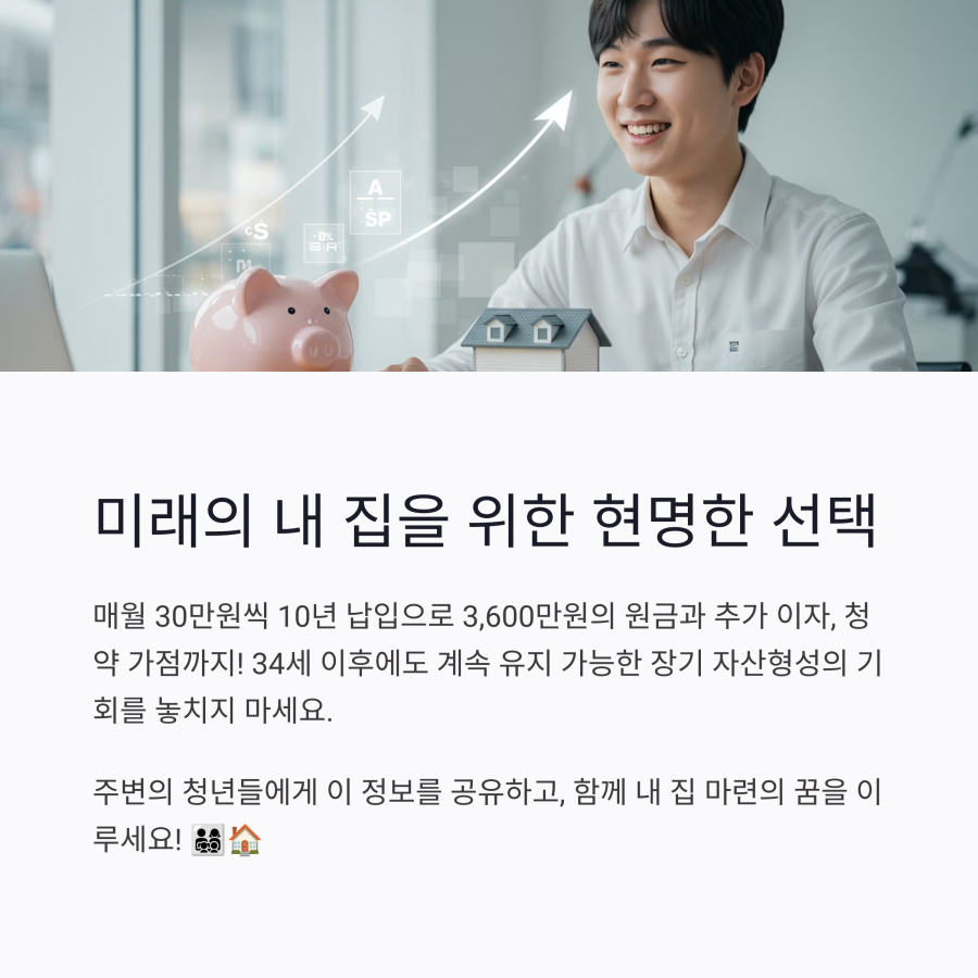 10년 동안 꾸준히 납입하면 3,600만원 + 이자 + 소득공제 + 높은 청약 가점을 얻게 되어 내 집 마련에 한 걸음 더 가까워질 수 있답니다.