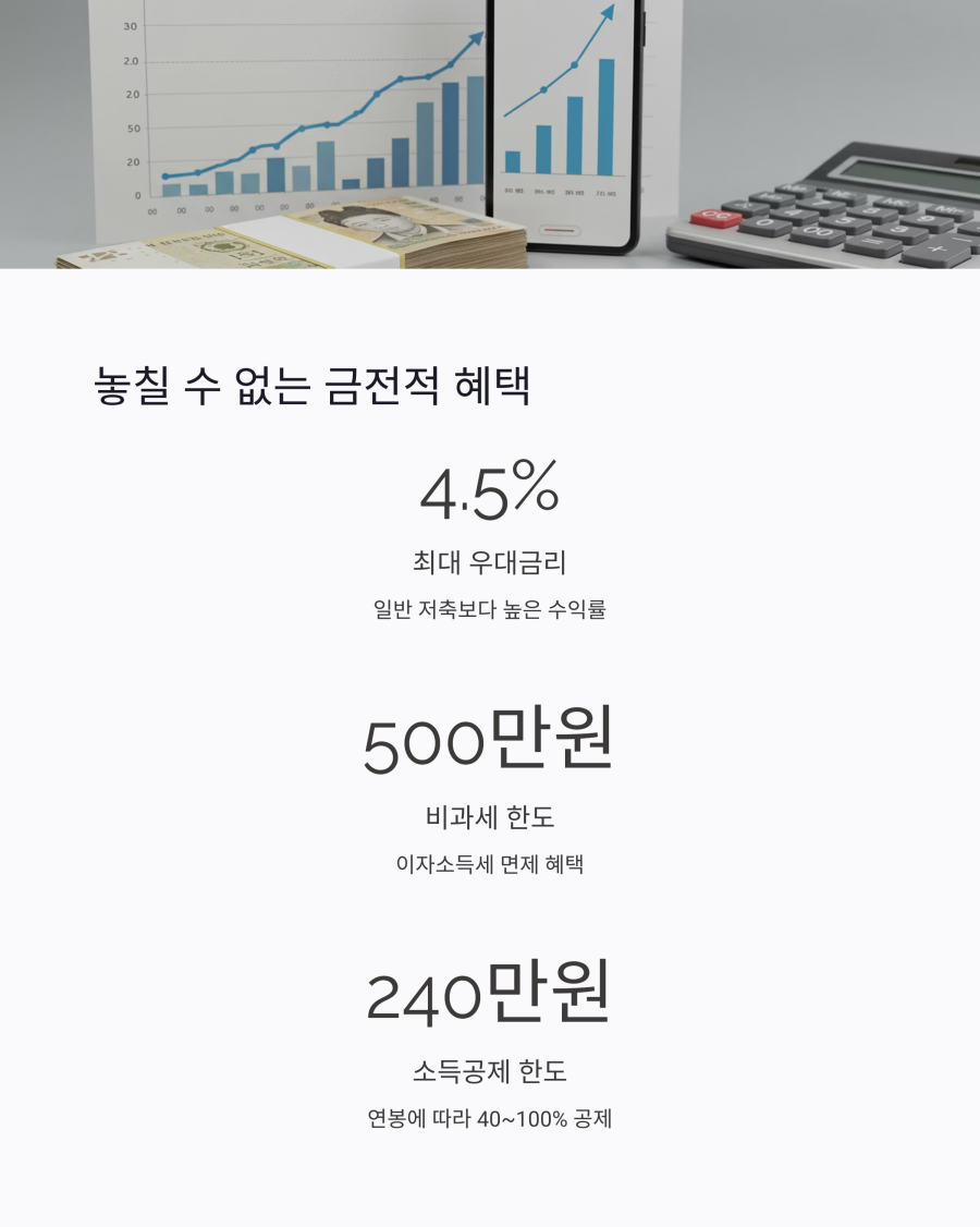 또한 소득공제와 이자소득세 비과세 혜택을 더 오래 누릴 수 있어요. 특히 사회생활을 막 시작한 20대라면 세금 혜택은 정말 달콤하죠! 😉