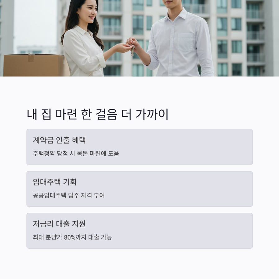 게다가 청약 시 가점을 받아 내 집 마련 기회도 높아져요. 특별공급에 지원할 수 있는 자격도 생기고요.