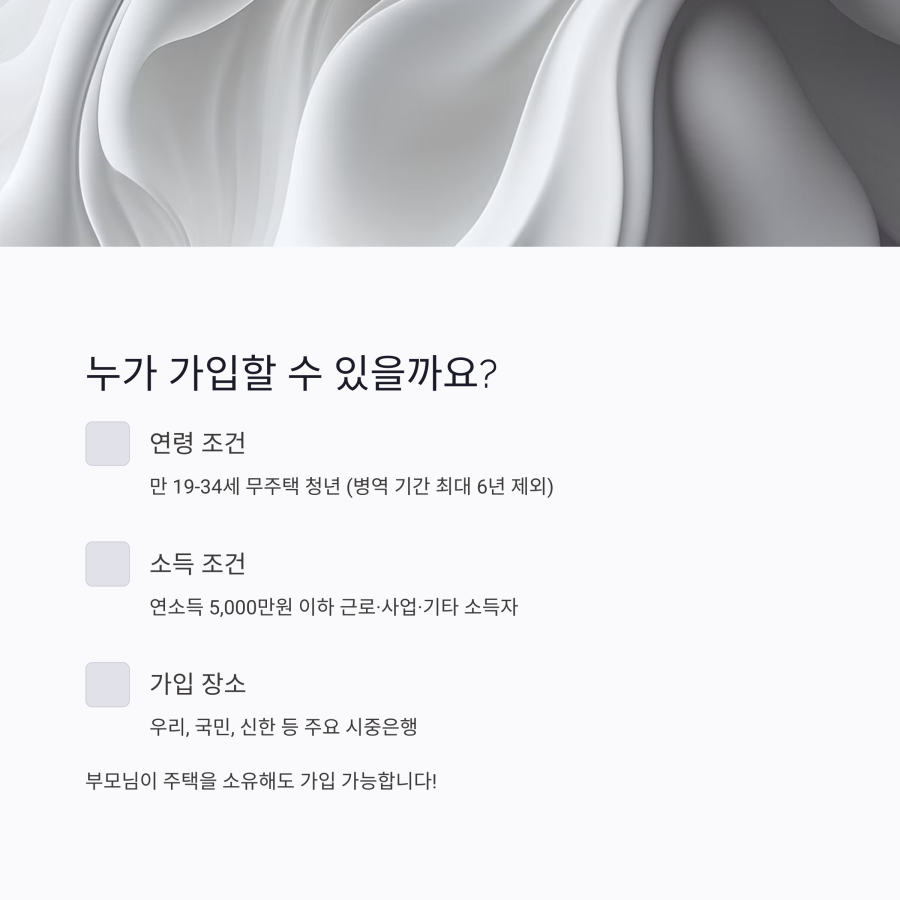요즘 집값은 계속 오르고, 내 집 마련은 점점 어려워지고 있어요. 하지만 청년청약통장에 가입하면 내 집 마련의 첫 발걸음을 좀 더 수월하게 시작할 수 있답니다.