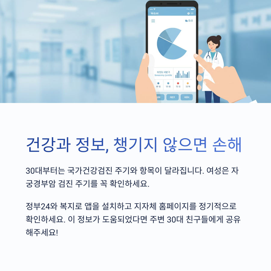 30대가 되면 국가건강검진의 주기와 항목이 달라집니다. 짝수 해에 태어난 사람과 홀수 해에 태어난 사람의 검진 해가 다르니 자신의 검진 연도를 꼭 확인하세요.