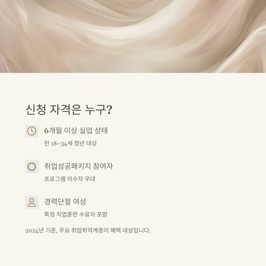 먼저 6개월 이상 실업 상태이거나, 취업성공패키지에 참여하신 분들이 주요 대상이에요. 또한 경력단절 여성이나 특정 직업훈련을 수료한 분들도 해당될 수 있답니다.