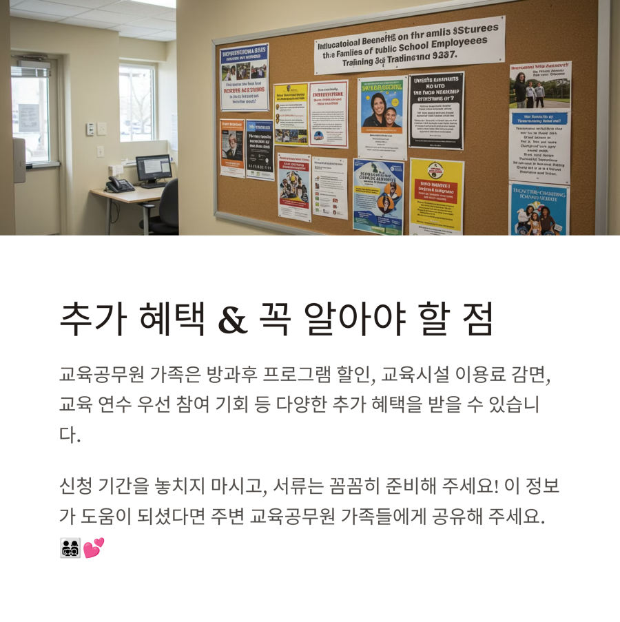 예를 들어, 방과후 학교 프로그램 할인, 교육 관련 시설 이용료 감면(도서관, 박물관 등), 교육 연수 참여 기회 등을 놓치는 경우가 많습니다.