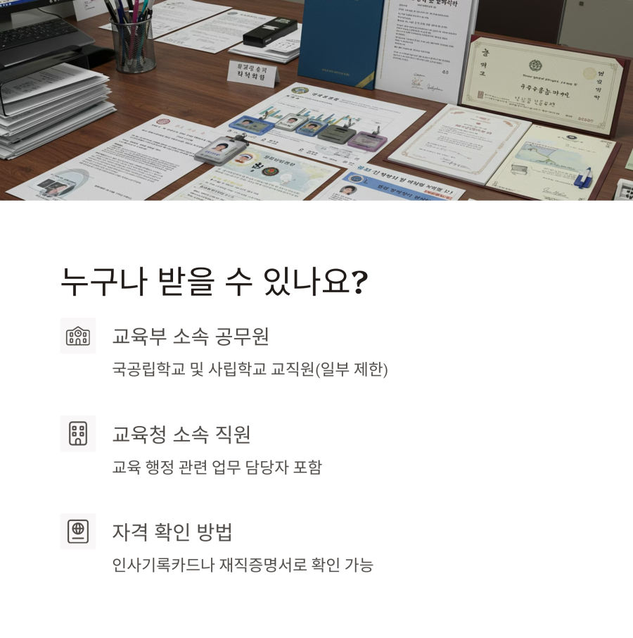 일반적으로 교육부 소속 공무원, 국공립학교 교직원, 사립학교 교직원(일부 제한 있음), 교육청 소속 직원 등이 해당됩니다.