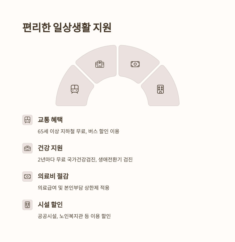 65세 이상 어르신은 지하철 무료 이용이 가능하며, 시내버스도 지역에 따라 무료나 할인 혜택을 제공해요. 또한 국립공원, 박물관, 미술관 등 다양한 공공시설 할인 혜택도 있습니다.