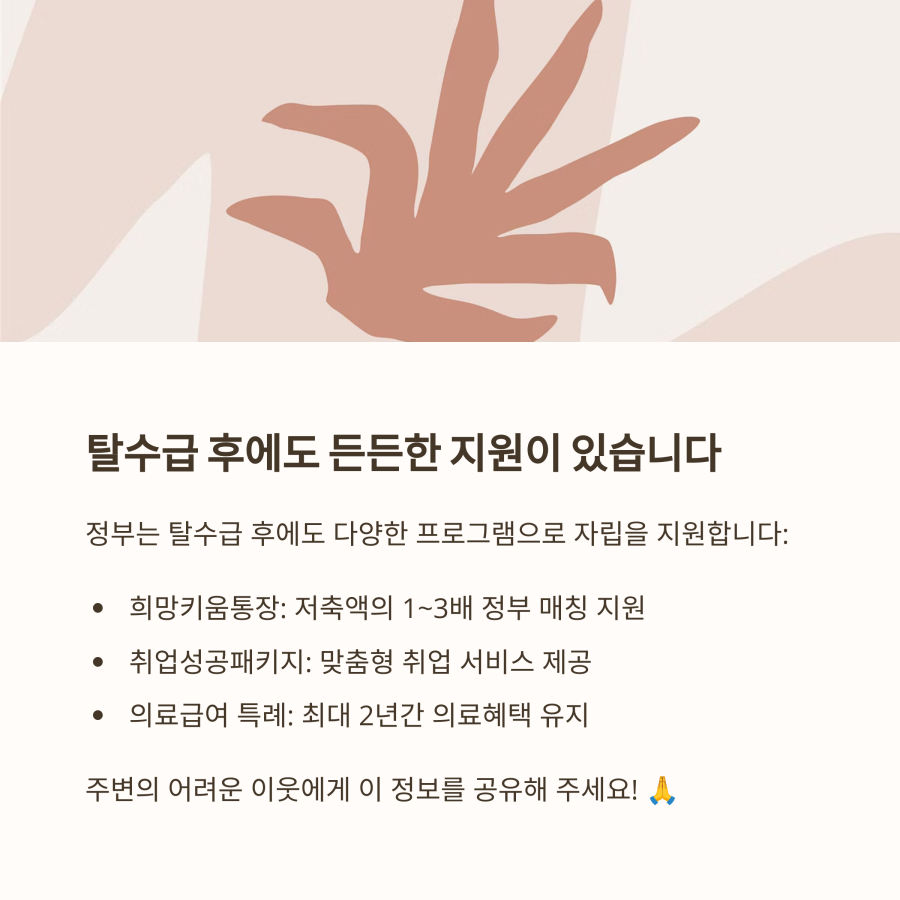 | 탈수급 후 혜택 | 자산형성 지원사업, 취업성공패키지 등 다양한 자립 지원 프로그램 이용 가능 |