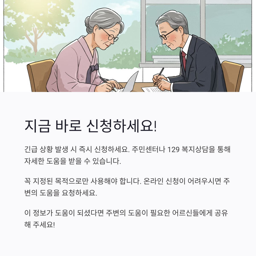 이제 어르신들도 긴급보호비 신청에 자신감을 가지셨길 바랍니다. 혜택을 받을 수 있는 자격이 되신다면 꼭 신청해보세요. 모르는 부분이 있다면 언제든 주민센터나 복지콜센터(129)로 문의하시면 친절하게 안내받으실 수 있습니다.