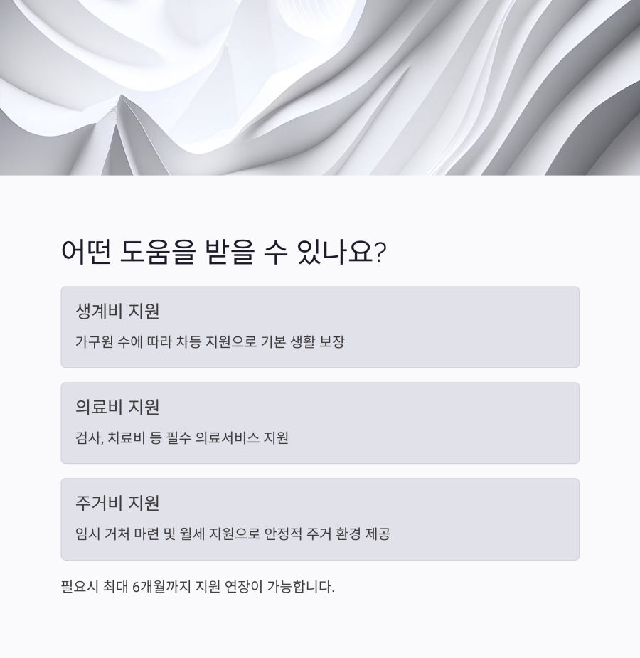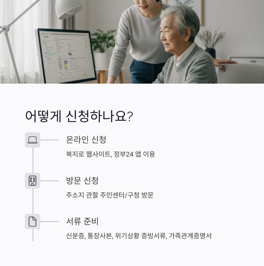 그리고 위기 상황 증빙서류가 꼭 필요해요. 예를 들어 의료비 지원을 받으려면 진단서와 의료비 영수증을, 주거지원을 받으려면 임대차계약서를 준비해야 합니다.