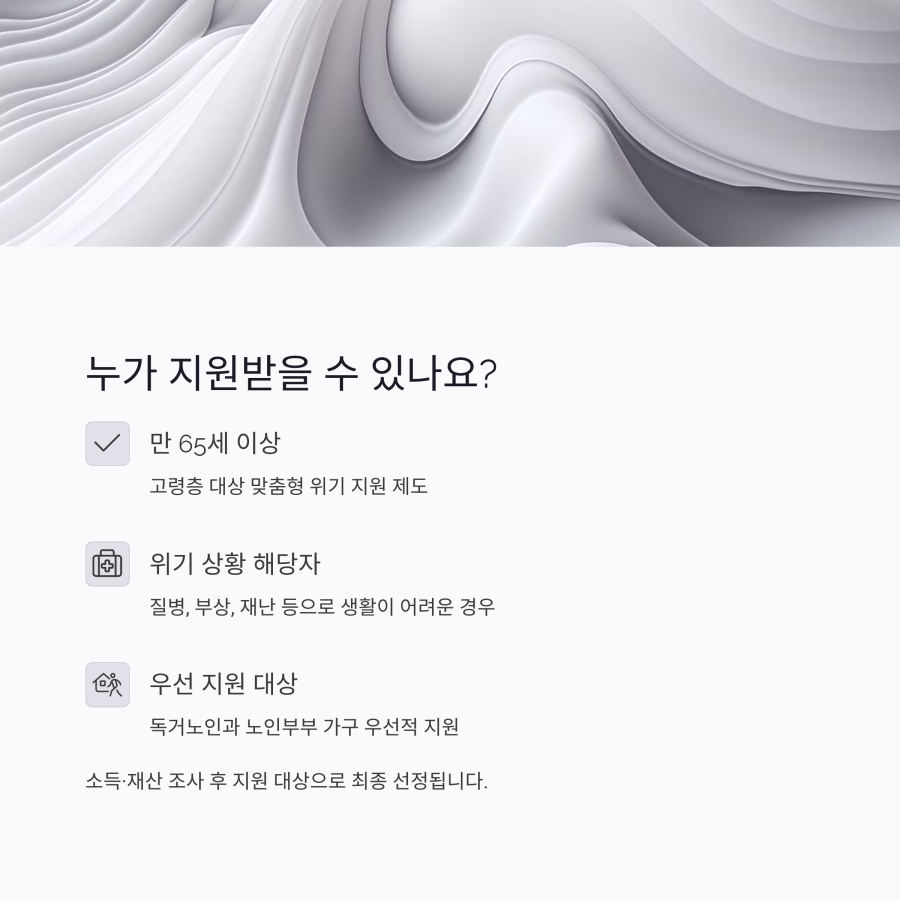긴급보호비를 신청하려면 우선 자격 요건을 확인해야 합니다. 만 65세 이상이면서 다음 중 하나에 해당하는 분들이 대상이 됩니다.