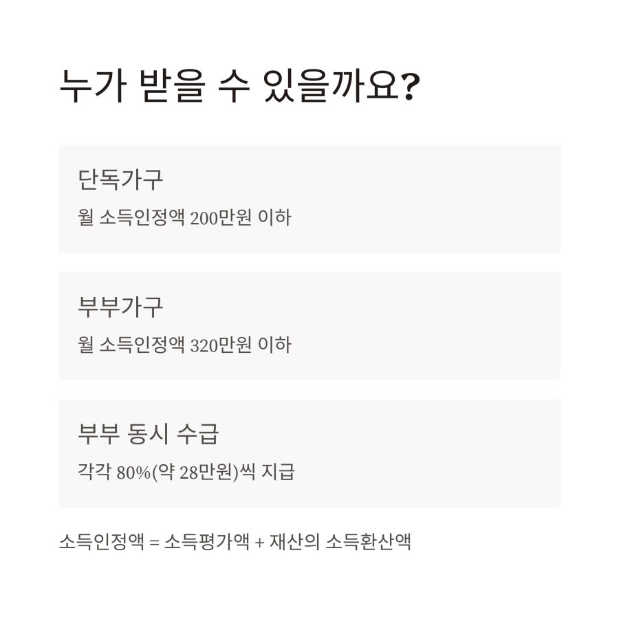 2025년 기준으로 단독가구는 약 200만원, 부부가구는 약 320만원 이하일 때 수급 자격이 주어진답니다.